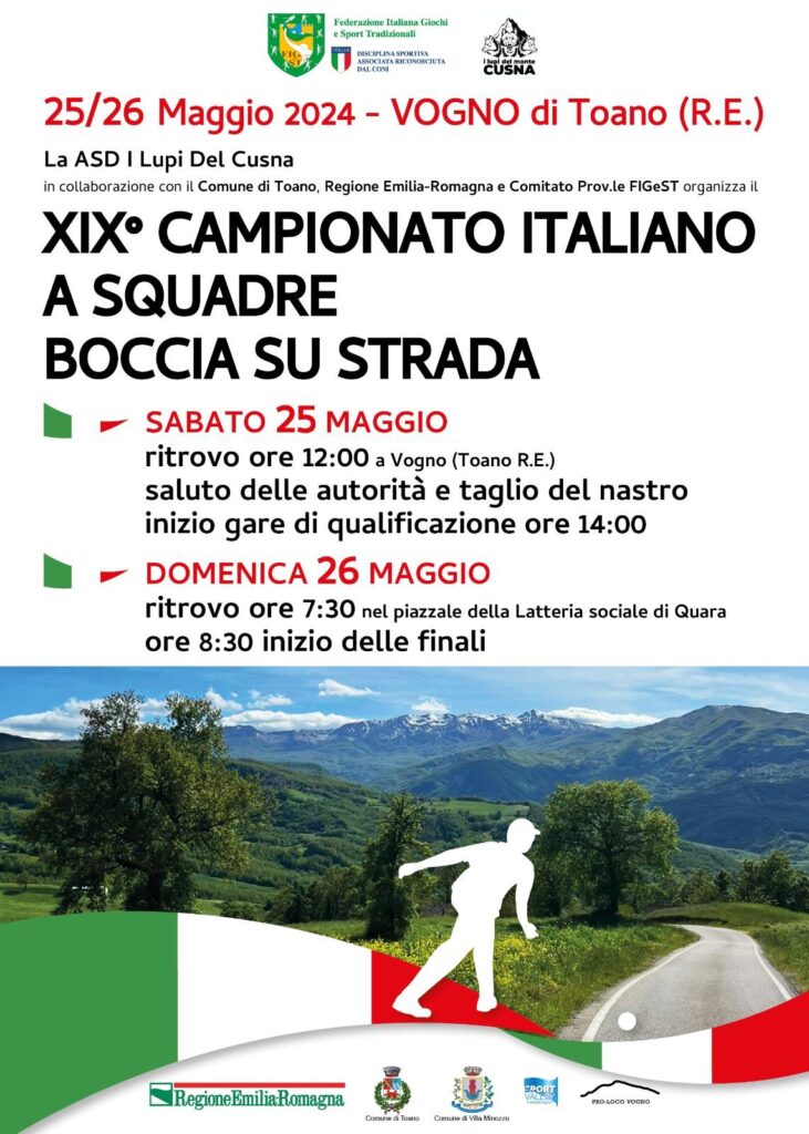 Nel Reggiano, terra di questa disciplina, sabato e domenica prossimi (24 e 25 maggio), arriva il Campionato italiano a squadre di boccia su strada, specialità riconosciuta dalla Figest, la Federazione Italiana Giochi e Sport Tradizionali, che promuove l’evento sportivo tricolore organizzato dall’Asd I Lupi del Cusna in collaborazione con il Comune di Toano, la Regione Emilia – Romagna e il Comitato provinciale Figest.